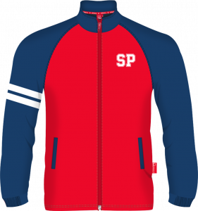 Chándal colegio Cardenal Spínola (chaqueta + pantalón) de acetato mate perchado. Se utiliza como prenda deportiva en educación primaria y secundaria. El pantalón es azul pantone, lleva cordón regulable en cinturilla y bolsillos laterales. Tiene bordado el logo de fundación Spínola en delantero de pierna derecha y en pierna izquierda lleva serigrafiado SPÍNOLA. La chaqueta va combinada en rojo y azul pantone, con serigrafía en espalda y bordado en pecho izquierdo. Ambas prendas llevan etiquetas y cubrecosturas personalizadas.